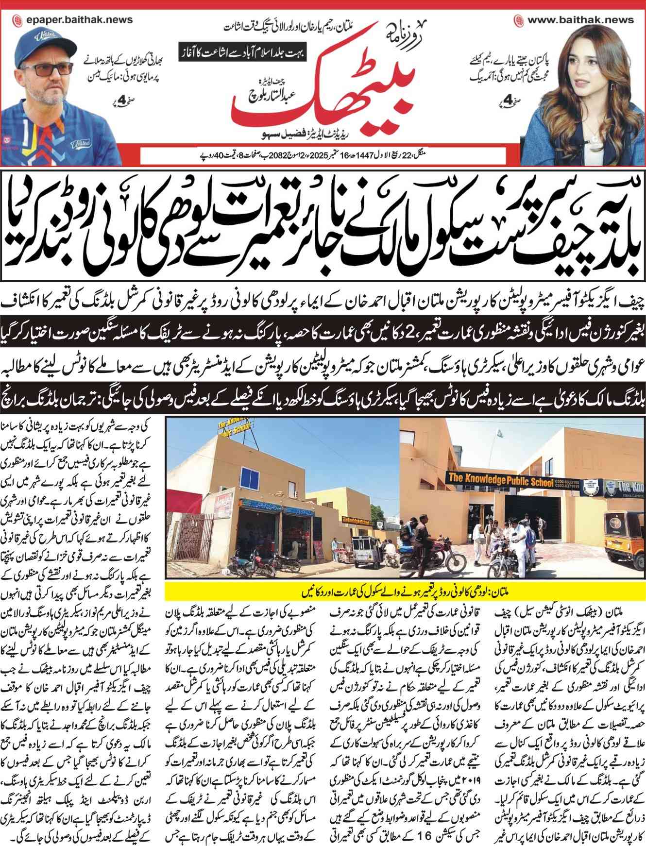 ملتان (بیٹھک انوسٹی گیشن سیل) چیف ایگزیکٹو آفیسر میٹروپولیٹن کارپوریشن ملتان اقبال احمد خان کی ایما پر لودھی کالونی روڈ پر ایک غیر قانونی کمرشل بلڈنگ کی تعمیر کا انکشاف، کنورژن فیس کی ادائیگی اور نقشہ منظوری کے بغیر عمارت تعمیر، پرائیویٹ سکول کے علاوہ دو دکانیں بھی عمارت کا حصہ۔تفصیلات کے مطابق ملتان کے معروف علاقے لودھی کالونی روڈ پر واقع ایک کنال سے زیادہ رقبے پر ایک غیر قانونی کمرشل بلڈنگ تعمیر کی گئی ہے۔ بلڈنگ کے مالک نے بغیر کسی اجازت کے عمارت کر کے اس میں ایک سکول قائم کر لیا۔ ذرائع کے مطابق چیف ایگزیکٹو آفیسر میٹروپولیٹن کارپوریشن ملتان اقبال احمد خان کی ایما پر اس غیر قانونی عمارت کی تعمیر عمل میں لائی گئی جو نہ صرف قوانین کی خلاف ورزی ہے بلکہ پارکنگ نہ ہونے کی وجہ سے ٹریفک کے حوالے سے بھی ایک سنگین مسئلہ اختیار کر چکی ہےانہوں نے بتایا کہ بلڈنگ کی تعمیر کے لیے متعلقہ حکام نے نہ تو کنورژن فیس وصول کی اور نہ ہی نقشہ کی منظوری دی گئی بلکہ صرف کاغذی کاروائی کے طور پر فسیلٹیشن سنٹر پر فائل جمع کروا کر کارپوریشن کے سربراہ کی سہولت کاری کے نتیجے میں عمارت تعمیر کر لی گئی۔ان کا کہنا تھا کہ ۲۰۱۹ میں پنجاب لوکل گورنمنٹ ایکٹ کی منظوری دی گئی تھی جس کے تحت شہری علاقوں میں تعمیراتی منصوبوں کے لیے قواعد و ضوابط وضع کیے گئے ہیں جس کی سیکشن 16 کے مطابق کسی بھی تعمیراتی منصوبے کی اجازت کے لیے متعلقہ بلڈنگ پلان کی منظوری ضروری ہے۔ اس کے علاوہ اگر زمین کو کمرشل یا رہائشی مقصد کے لیے تبدیل کیا جا رہا ہو تو متعلقہ تبدیلی کی فیس بھی ادا کرنا ضروری ہے۔ان کا کہنا تھا کہ کسی بھی عمارت کو رہائشی یا کمرشل مقصد کے لیے استعمال کرنے سے پہلے اس کے لیے بلڈنگ پلان کی منظوری حاصل کرنا ضروری ہے جبکہ اسی طرح اگر کوئی شخص بغیر اجازت کے بلڈنگ کی تعمیر کرتا ہے تو اسے بھاری جرمانہ اور تعمیرات کو مسمار کرنے کا سامنا کرنا پڑ سکتا ہےان کا کہنا تھا کہ اس بلڈنگ کی غیرقانونی تعمیر نے ٹریفک کے مسائل کو بھی جنم دیا ہے کیونکہ سکول لگنے اور چھٹی کے وقت یہاں ہر وقت ٹریفک جام رہتا ہے جس کی وجہ سے شہریوں کو بہت زیادہ پریشانی کا سامنا کرنا پڑتا ہے۔ان کا کہنا تھا کہ یہ ایک بلڈنگ نہیں ہے جو مطلوبہ سرکاری فیسیں جمع کرائے اور منظوری لئے بغیر تعمیر ہوئی ہے بلکہ پورے شہر میں ایسی غیرقانونی تعمیرات کی بھرمار ہے۔عوامی اور شہری حلقوں نے ان غیر قانونی تعمیرات پر اپنی تشویش کا اظہار کرتے ہوئے کہا کہ اس طرح کی غیر قانونی تعمیرات سے نہ صرف قومی خزانے کو نقصان پہنچتا ہے بلکہ پارکنگ نہ ہونے اور نقشے کی منظوری کے بغیر تعمیرات دیگر مسائل بھی پیدا کرتی ہیںانہوں نے وزیراعلی مریم نواز، سیکریٹری ہاوسنگ نور الامین مینگل کمشنر ملتان جو کہ میٹروپولیٹین کارپویشن ملتان کے ایڈمنسٹیٹر بھی ہیں سے معاملے کا نوٹس لینے کا مطالبہ کیا اس سلسلے میں روزنامہ بیٹھک نے جب چیف ایگزیکٹو آفیسر اقبال احمد خان کا موقف جاننے کے لئے رابطہ کیا تو وہ رابطے میں نہ آ سکے جبکہ بلڈنگ برانچ کے محمد واجد نے بتایا کہ بلڈنگ کا مالک یہ دعوی کرتا ہے کہ اسے زیادہ فیس جمع کرانے کا نوٹس بھیجا گیا جس کے بعد فیسوں کا تعین کرنے کے لئے ایک خط سیکریٹری ہاوسنگ، اربن ڈویپلمنٹ اینڈ پبلک ہیلتھ انجینئرنگ ڈیپارٹمنٹ کو بھیجا گیا ہےان کا کہنا تھا کہ سیکریٹری کے فیصلے کے بعد فیسوں کی وصولی کی جائے گی۔