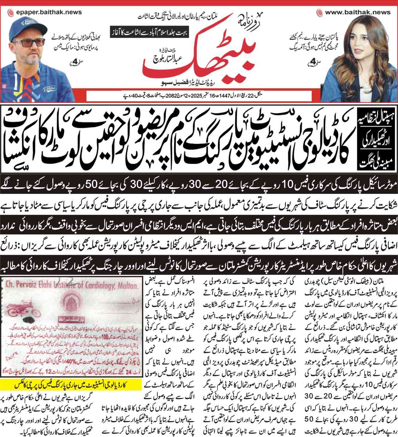 ملتان (بیٹھک انوسٹی گیشن سیل) چوہدری پرویز الٰہی انسٹیٹیوٹ آف کارڈیالوجی میں پارکنگ کے نام پر مریضوں اور ان کے لواحقین سے لوٹ مار کا انکشاف، ہسپتال انتظامیہ اور میٹرو پولیٹن کارپوریشن خاموش تماشائی بن گئے۔ ذرائع کے مطابق ہسپتال کی انتظامیہ اور پارکنگ ٹھیکیدار کی مبینہ ملی بھگت سے مریضوں کو مقررہ ریٹس سے زائد رقم ادا کرنے پر مجبور کیا جا رہا ہے۔موقع پر موجود شہریوں نے بتایا کہ موٹر سائیکل کی پارکنگ کی سرکاری فیس 10 روپے ہے مگر پارکنگ کا ٹھیکیدار مریضوں اور ان کے لواحقین سے 20 سے 30 روپے وصول کر رہا ہے۔ انہوں نے بتایا کہ اسی طرح کار کے لیے 30 روپے کی بجائے 50 روپے وصول کئے جا رہے ہیں شہریوں نے شکایت کی کہ جب پارکنگ سٹاف سے زائد وصولی پر اعتراض کیا جاتا ہے تو وہ بدتمیزی سے پیش آتے ہیں ہے اور لڑنے پر اتر آتے ہیں جبکہ شکایت کرنے والے افراد کو دھمکایا بھی جاتا ہے۔انہوں نے بتایا کہ شہریوں کو جو پارکنگ سٹینڈ کا عملہ جو پرچی جاری کرتا ہے اس پر لکھی پارکنگ فیس کو مارکر یا سیاسی سے مٹا دیتا ہےہسپتال ذرائع کے مطابق میڈیکل سپرنٹینڈنٹ چوہدری پرویز الٰہی انسٹیٹیوٹ آف کارڈیالوجی اور ہسپتال کے دیگر انتظامی افسران کو اس صورتحال کا بخوبی علم ہے مگر انہوں نے تاحال اس مسئلے پر کوئی کارروائی نہیں کی۔شہریوں کا کہنا ہے کہ ہسپتال ایک حساس جگہ ہے جہاں صرف مریض اور ان کے لواحقین آتے ہیں ایسے میں ان سے ناجائز پیسے لینا انتہائی افسوسناک عمل ہے۔بعض متاثرہ افراد نے بتایا کہ انہیں ہر بار پارکنگ کی فیس مختلف بتائی جاتی ہے جس سے لگتا ہے کہ کوئی طے شدہ اصول و ضوابط موجود ہی نہیں ہیں۔انہوں نے بتایا کہ اضافی پارکنگ فیس وصولی کے ساتھ ساتھ ہیلمٹ کے الگ سے پیسے وصول کئے جاتے ہیں اور لوگوں کی مجبوری کا فایدہ اٹھایا جاتا ہےانہوں نے بتایا کہ بااثر ٹھیکیدار کے خلاف میٹرو پولیٹن کارپوریشن کا عملہ بھی کاروائی کرنے سے گریزاں ہےشہریوں نے اعلیٰ حکام خاص طور پر کمشنر ملتان جو کہ کارپوریشن کے ایڈمنسٹریٹر بھی ہیں سے صورتحال کا نوٹس لینے اور اوور چارجنگ پر ٹھیکیدار کے خلاف کاروائی کا مطالبہ کیا۔