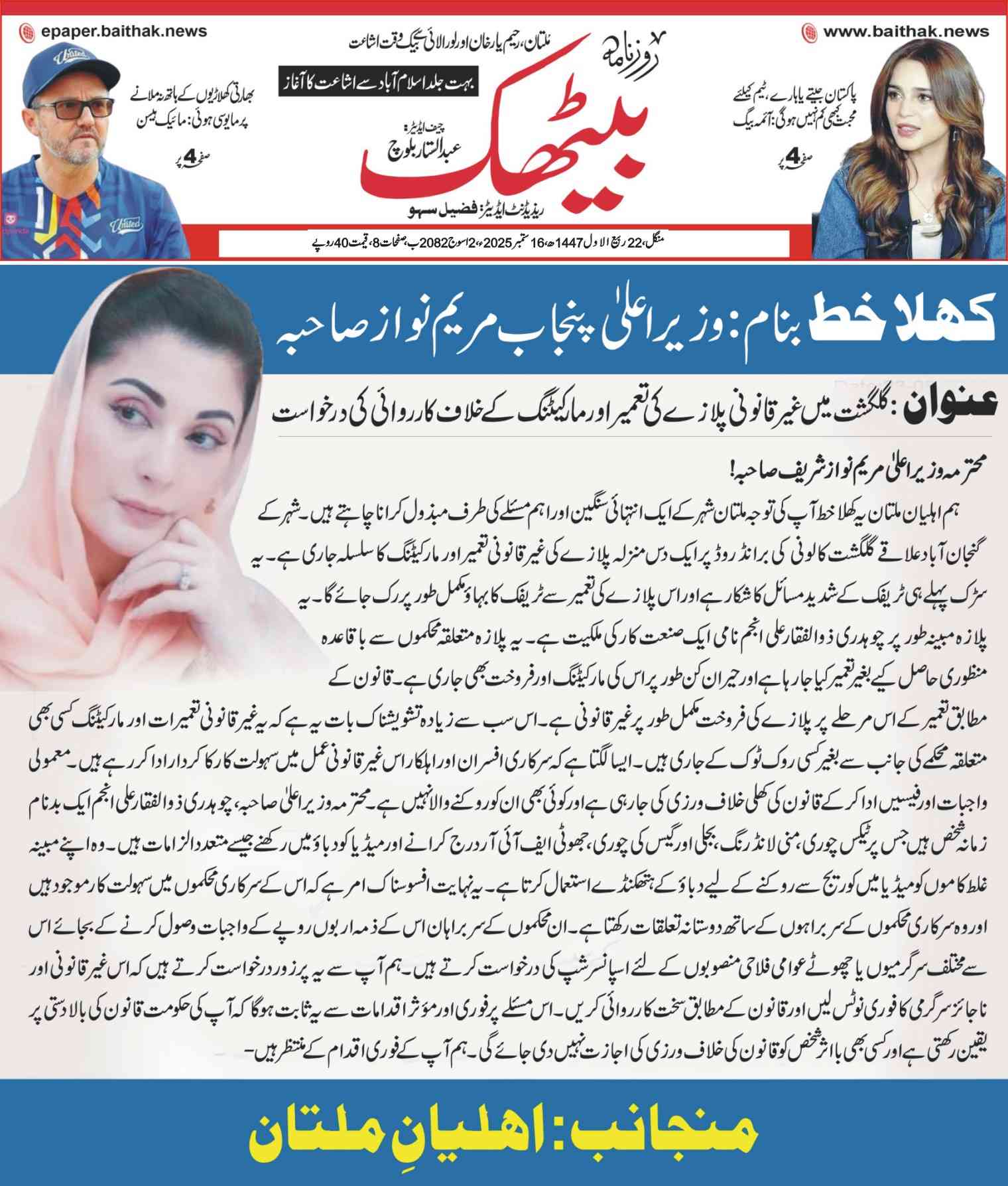 محترمہ وزیر اعلیٰ مریم نواز شریف صاحبہ! ہم اہلیان ملتان یہ کھلا خط آپ کی توجہ ملتان شہر کے ایک انتہائی سنگین اور اہم مسئلے کی طرف مبذول کرانا چاہتے ہیں۔ شہر کے گنجان آباد علاقے گلگشت کالونی کی برانڈ روڈ پر ایک دس منزلہ پلازے کی غیر قانونی تعمیر اور مارکیٹنگ کا سلسلہ جاری ہے۔ یہ سڑک پہلے ہی ٹریفک کے شدید مسائل کا شکار ہے اور اس پلازے کی تعمیر سے ٹریفک کا بہاؤ مکمل طور پر رک جائے گا۔یہ پلازہ مبینہ طور پر چوہدری ذوالفقار علی انجم نامی ایک صنعت کار کی ملکیت ہے۔ یہ پلازہ متعلقہ محکموں سے باقاعدہ منظوری حاصل کیے بغیر تعمیر کیا جا رہا ہے اور حیران کن طور پر اس کی مارکیٹنگ اور فروخت بھی جاری ہے۔ قانون کے مطابق تعمیر کے اس مرحلے پر پلازے کی فروخت مکمل طور پر غیر قانونی ہے۔اس سب سے زیادہ تشویشناک بات یہ ہے کہ یہ غیر قانونی تعمیرات اور مارکیٹنگ کسی بھی متعلقہ محکمے کی جانب سے بغیر کسی روک ٹوک کے جاری ہیں۔ ایسا لگتا ہے کہ سرکاری افسران اور اہلکار اس غیر قانونی عمل میں سہولت کار کا کردار ادا کر رہے ہیں۔ معمولی واجبات اور فیسیں ادا کر کے قانون کی کھلی خلاف ورزی کی جا رہی ہے اور کوئی بھی ان کو روکنے والا نہیں ہے۔محترمہ وزیر اعلیٰ صاحبہ، چوہدری ذوالفقار علی انجم ایک بدنام زمانہ شخص ہیں جس پر ٹیکس چوری، منی لانڈرنگ، بجلی اور گیس کی چوری، جھوٹی ایف آئی آر درج کرانے اور میڈیا کو دباؤ میں رکھنے جیسے متعدد الزامات ہیں۔ وہ اپنے مبینہ غلط کاموں کو میڈیا میں کوریج سے روکنے کے لیے دباؤ کے ہتھکنڈے استعمال کرتا ہے۔ یہ نہایت افسوسناک امر ہے کہ اس کے سرکاری محکموں میں سہولت کار موجود ہیں اور وہ سرکاری محکموں کے سربراہوں کے ساتھ دوستانہ تعلقات رکھتا ہے۔ ان محکموں کے سربراہان اس کے ذمہ اربوں روپے کے واجبات وصول کرنے کے بجائے اس سے مختلف سرگرمیوں یا چھوٹے عوامی فلاحی منصوبوں کے لئے اسپانسرشپ کی درخواست کرتے ہیں۔ہم آپ سے یہ پرزور درخواست کرتے ہیں کہ اس غیر قانونی اور ناجائز سرگرمی کا فوری نوٹس لیں اور قانون کے مطابق سخت کارروائی کریں۔ اس مسئلے پر فوری اور مؤثر اقدامات سے یہ ثابت ہو گا کہ آپ کی حکومت قانون کی بالادستی پر یقین رکھتی ہے اور کسی بھی بااثر شخص کو قانون کی خلاف ورزی کی اجازت نہیں دی جائے گی۔ہم آپ کے فوری اقدام کے منتظر ہیں